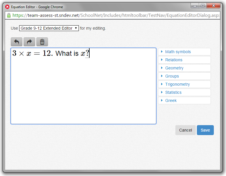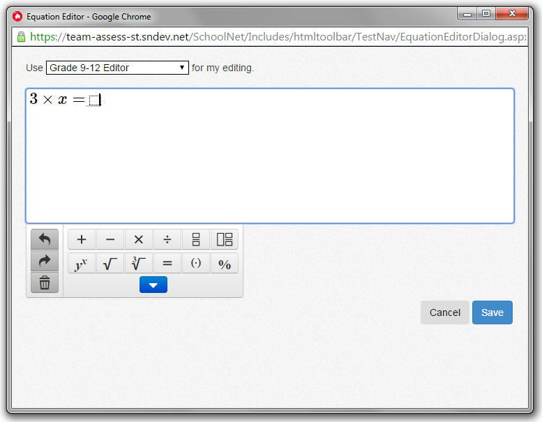 Use the Equation Editor to enter math equations for a test question, answer, or passage. You can select one of six equation editors appropriate for different grade levels, with a basic or extended editor. The basic editor allows you to enter letter variables but no spaces or other punctuation. With the extended editor, you can enter complete sentences with spaces and other punctuation.